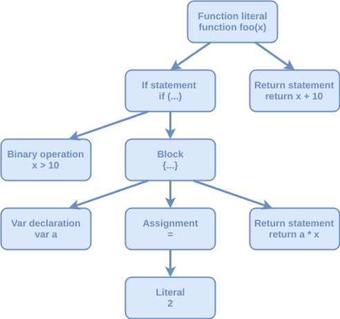 The way to go with such question would be breaking down the code into nodes, where each node represents a part in our code and all the nodes are connected with each other in a relational manner. This whole node formation is called AST — abstract syntax tree, which can be used to easily lookup scopes and variables and other elements which are related to our code.